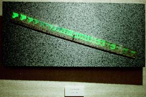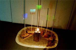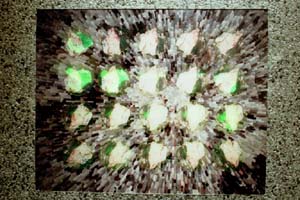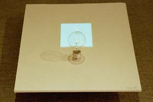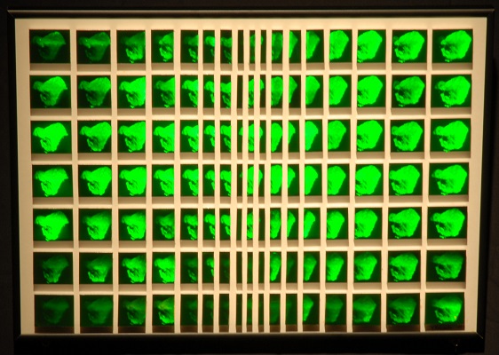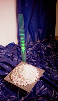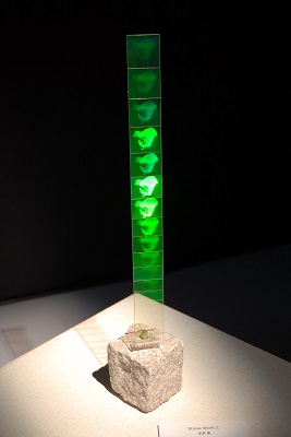 実物の石の上にセンサーにより回転する立体像であるホログラムと平面像である石の写真を配置し、虚像と実像との対比を表現した作品